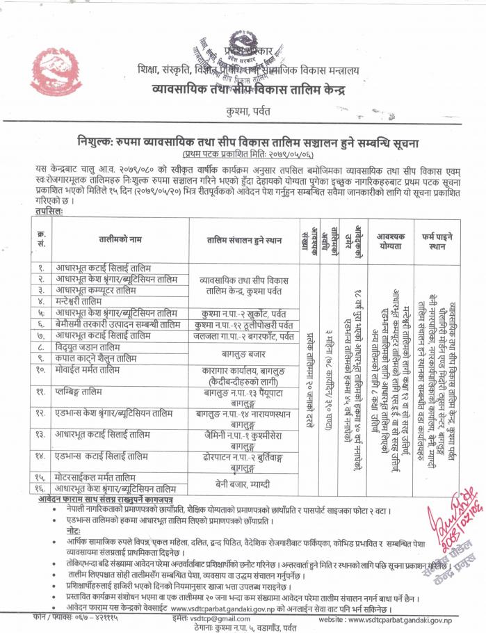 निशुल्क रुपमा व्यावसायिक तथा सिप विकास तालिम सञ्चालन हुने सम्बन्धि व्यावसायिक तथा सिप विकास तालिम केन्द्र, कुश्मा पर्वतको सूचना